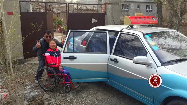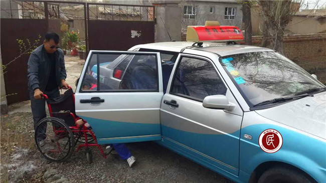 新疆民生网讯 (通讯员 杨辉)4月13日上午九点,阜康市雪莲花路社区33号楼居民孟士兵---雷锋车队队长,放弃出租车早高峰宝贵的营运时间,到距离市区十多公里外的黄土梁三队接马红。马红患有少见的脊髓脊膜膨出症,孩子的脊椎、脊髓、神经先天发育失常,导致大小便失禁,双足外翻无法行走,但身残志坚,性格开朗。