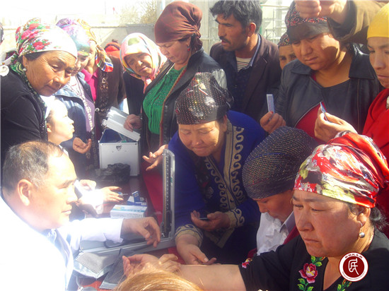 此时的大队部一片欢声笑语,来自五洲男科医院、博爱医院的医务志愿者们正在为群众做测血糖、量血压、心肺听诊、检测骨密度、叩诊等多个项目的体检,同时还用通俗易懂的语言向群众讲解了高血压、糖尿病等常见疾病的医疗保健知识。“阿依先木汗阿姨,你的糖尿病可以先到乡里登记,国家会免费为你提供药品来控制病情。”、“库尔班大叔,你的血压处在正常指标的临界点,平时要注意饮食习惯,坚持锻炼,少吃油腻的食品”,参加活动的年轻姑娘志愿者的热情提醒把义诊活动推向了高潮。
