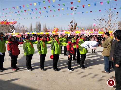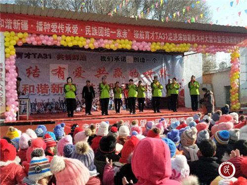 团队的全体成员上台表演集体舞蹈,展示了他们积极向上,不忘初心,继续前进的决心与团队风采。同时,学校也让孩子们精心编排了集体舞蹈,六年级学生鲁吐普拉·买买提的一曲《天亮了》把现场气氛推向了高潮。工作队为了答谢爱心人士的大爱付出,以特有的礼节和习俗,为此次开展公益捐赠活动爱心人士赠送了维吾尔族小花帽,客人们戴着小花帽与当地各族师生,各族群众一起跳起了维吾尔族传统舞蹈《麦西来普》,场面温馨又以一种方式在传达着一种爱。