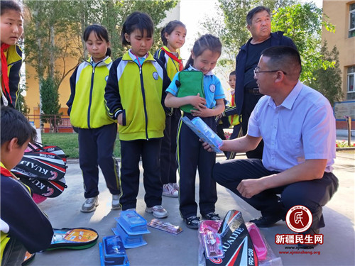 5月29日这天, 爱心队伍带着书包、文具盒、铅笔、羽毛球拍、乒乓球拍等儿童节的礼物,在党支部书记张希成的带领下,新兴党组织成员、村干部、工作队来到了城关镇中心小学,孩子们拿着花花绿绿的书包、文具盒,爱不释手的像捡到了宝,哈萨克族小姑娘吾里江腼腆的小声说:“我想要粉色的小书包,粉色的文具盒。”刘兴堂说:“好!你喜欢哪个你自己挑。”在欢快和喜悦的氛围当中,大家不忘勉励孩子们,一定要好好学习,长大以后做一个对家乡、对祖国、对人民有用的人。