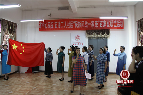 随着石油工人社区带来的《欢聚一堂》精彩歌舞表演,由克拉玛依市中心医院和石油工人社区联合举办的民族团结一家亲百家宴活动拉开序幕。中心医院带来红歌演唱得到了居民一阵阵叫好声,中心医院带领全体人员宣誓环节更是将活动推向了高潮,为了让气氛更加活跃,开展了有奖问答环节,居民纷纷举手回答,竞争激烈。随后,就到了最关键的是美食评选环节,该环节由主持人介绍评比菜品并由评委进行打分,经过激烈角逐,居民马丽亚老人做的的菜饼最终摘得桂冠。