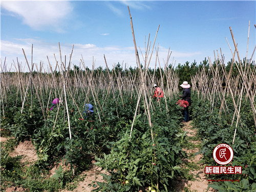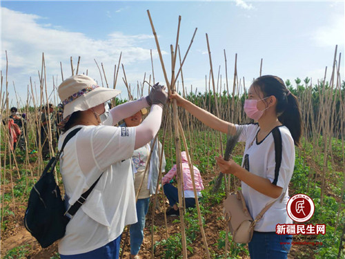西红柿绑秧时期,结亲干部石老师几乎每天都到地里帮忙绑秧。绑秧要松紧适度,把果穗调整在架内,防止茎蔓下坠,普通人干上一天腰都直不起来,但是石老师一想到他的劳动能换来亲戚的丰收,累和疼都忘记了。