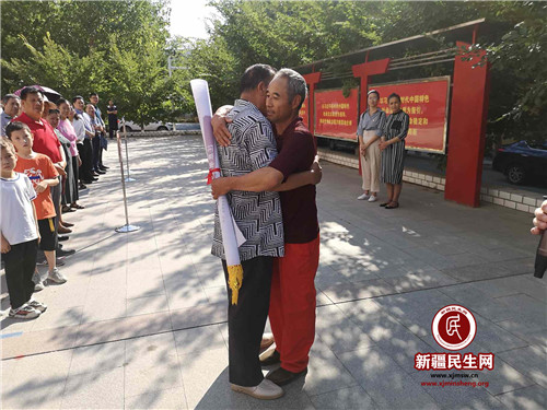 多年邻居变成亲。如今,这两个不同民族的家庭早已亲如一家。2019年7月8日的社区周一升国旗仪式上,在芙蓉社区飘扬的国旗见证下,许改名将一面锦旗递送到阿不都热依木手中,两个不善于表达的兄弟,紧紧地抱在了一起。