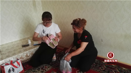 肉孜·依木拉依木夫妻两人都已经年过50,妻子在华能当保安,其为市园林处聘用干部,儿子在外地打工,经济情况一直不好,夫妻两人生活很节俭,平时儿子也没法照顾父母。工作队队员在得知其妻子最近脚有些不舒服,利用轮休期间,精心挑选了舒适的拖鞋和两双平底鞋给亲戚送去。肉孜·依布拉依木说:“真的太意外了,你们平时工作那么忙,工作压力那么大,还对我们这么上心,就像我们的亲生女儿一样。真的太感谢你们了。”工作人员拉着亲戚的手说:“我们就是一家人,要常联系、多走动、多交流互学互助。”肉孜·依布拉依木国语特别好,工作队队员还在入户的过程中多学了一门语言,拉近了彼此间的距离。
