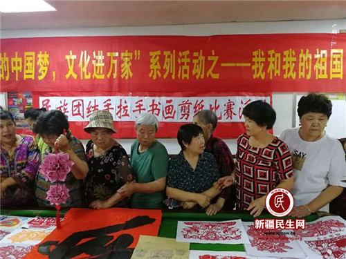 新疆民生网(鲁艳)为了加强社区民族团结,同时丰富社区文化生活,营造浓厚的社区文化氛围,充分展现中国书画、剪纸的艺术魅力,继承和弘扬传统的国粹文化艺术,提高居民的艺术修养、审美情趣,7月23日下午,双环社区举办了我和我的祖国“民族团结手拉手书画剪纸比赛”活动。居民通过绘画作品表达了自己对于伟大祖国的热爱。双环社区及联点单位干部结对亲戚、辖区居民及社区工作人员70余人参加了活动。