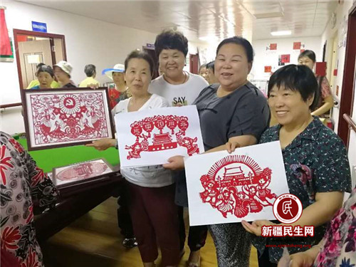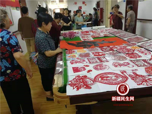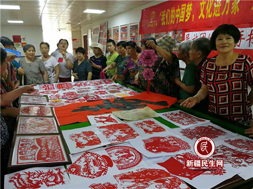 活动现场,陶淑珍阿姨带来了自己的一部分剪纸作品,一幅幅生动传神、精雕细琢的剪纸,让在场的观众赞不绝口,受益匪浅。在陶淑珍阿姨的指点下,大家按照步骤将彩纸折成形,谨慎精细地剪着手中的彩纸。大家时而转动着手中的纸,时而调整剪刀的角度,剪纸在手中上下翻飞,不一会一幅幅精美的窗花就摆在桌子上,让大家眼前一亮,同时还在交流着彼此的经验。“很早就想学剪纸了,今天终于可以跟老师请教学习啦!”辖区居民阿迪兰·艾力展示着自己手中的剪纸兴奋地说。活动现场互动氛围温馨而和谐。