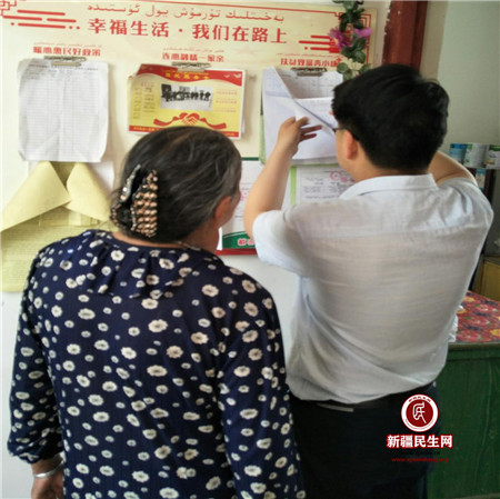 图二:孙涛和肉孜瓦娜木·阿布拉“阿帕”在圈中查看着“阿帕”一家所享受到的项目情况