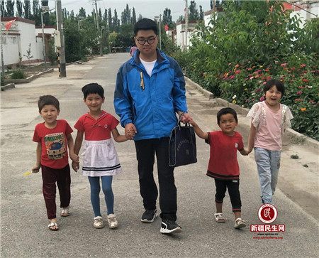 图四:孙涛牵着帕提曼·司马义、阿依左克拉·司马义等一群孩子行走在回家的路上