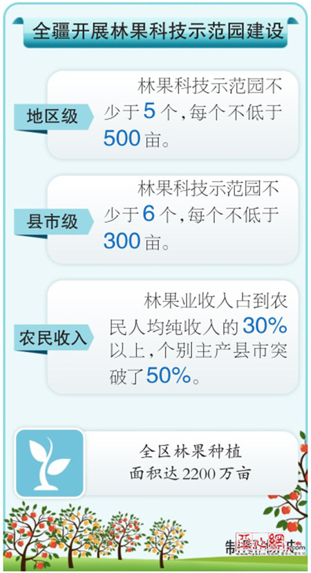 为提升新疆林果质量,去年我区深入实施了林果业提质增效工程,启动“专家服务团”开展“百千万”培训行动计划,不断优化区域布局和品种结构,扩大新疆林果产品在市场的占有率和品牌影响力。目前,新疆林果业已成为农民致富的重要力量,林果业收入占到农民人均纯收入的30%以上,个别主产县市突破了50%。特色林果业已成为南疆覆盖范围广、惠及人口多、发展潜力大的富民产业。