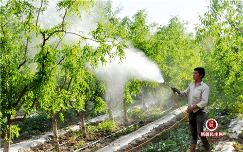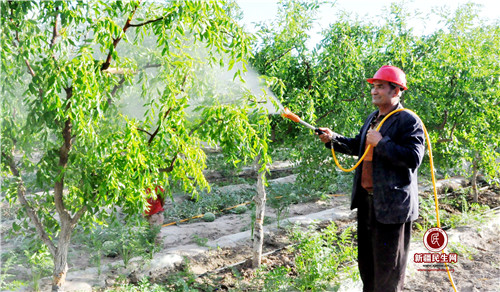 新疆民生网(颜寿林)6月16日,温宿县克孜勒镇依尔玛农民艾海提·托乎提给红枣树喷洒花粉剂,以提高红枣座果率。目前,温宿县40万亩红枣树进入挂果期,广大农民严格按照红枣树管理技术规程,采取对红枣树抹芽摘蕊、放蜂、人工授粉、松土除草、适时放水等措施,来提高红枣产出率和亩效益。