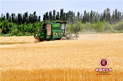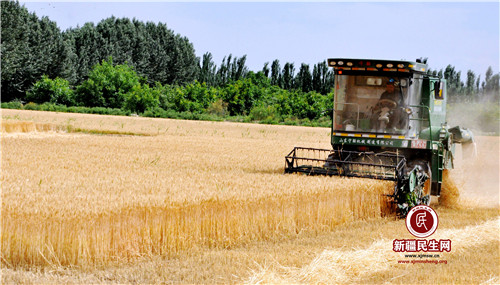 新疆民生网(颜寿林)6月16日,温宿县古勒阿瓦提乡英艾日克村农民使用机械收割小麦。时下“三夏”时节,温宿县农区麦浪滚滚、满目金黄,该县22.4万亩小麦成熟,麦收工作进入了高峰期,广大农民抓住天气晴好的有利时机,使用机械抢收小麦,乡村麦田地呈现出一派人欢车鸣的繁忙景象。