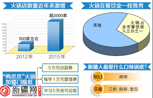 较低门槛是“鸭爪爪”等火锅模式推动乌鲁木齐火锅市场的重要推手。18 日,以“鸭爪爪”为例,记者上网搜索后,随意拨打了一部加盟电话,对方表示只需要5 万元加盟费,每年1万元管理费,学习5天就可迎客。