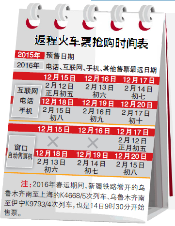 新疆网讯(记者王艳红)12月15日,互联网、电话和手机12306将开售2016年2月12日(大年初五)的火车票,春节后返程车票正式开售。记者从铁路部门了解到,按照往年旅客的出行习惯,春节后的大年初五至初十将是旅客的集中返程高峰期,因此12月15日至20日将是节后返程票的抢票高峰期。