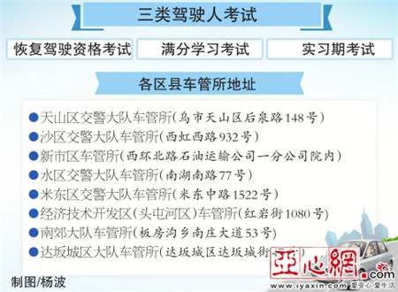 乌市公安局交警支队水磨沟区交警大队车辆管理所指导员杨燕解释说,这三类考试考的都是理论知识和交通法规,驾驶人只有参加了考试之后,才能恢复驾驶证的正常使用并重新上路行驶,或者正常通过A、B证的审验。