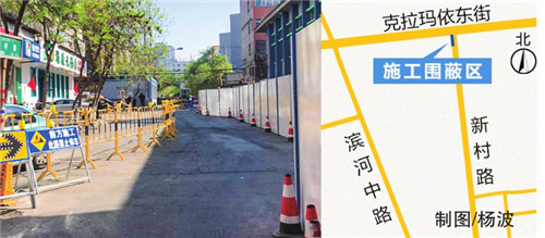 之前,新村路是双向两车道通行,施工围蔽后西侧车道被封闭,即由克拉玛依东街右转进入新村路北向南行驶的车辆无法正常通行。“我们通过将东侧的道路进行硬化,然后形成了一条新增的车道,以此来保证双向两车道正常通行。”任鹏说。