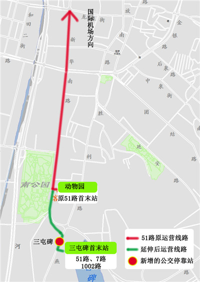 51路公交线路首末站由T3航站楼至南公园,调整为T3航站楼至三屯碑。新增新华南路部分路段、燕儿窝路,进入三屯碑公交车场。新增“三屯碑“站点。