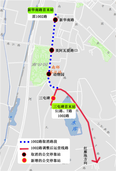 1002路首末站由红雁池至新华南路,调整为红雁池至三屯碑。取消“南公园”站、“英阿瓦提路口”站、“新华南路”站,新增“三屯碑”站。