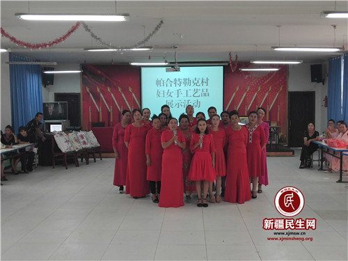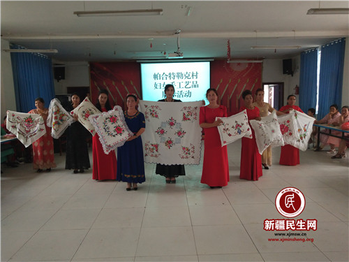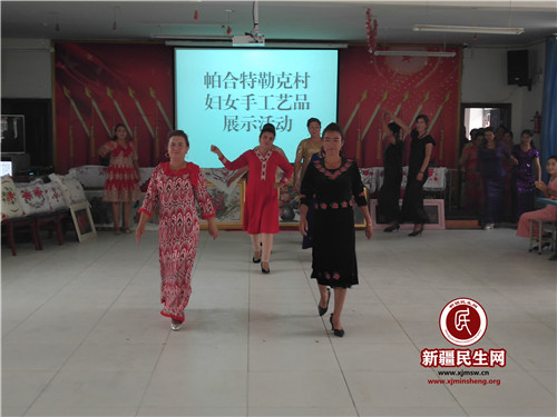 新疆民生网(梁佳妮) 7月29日,阿克苏市托普鲁克乡帕合特勒克村大礼堂里,妇女穿着美丽的艾德莱斯,跳着优美的舞姿,唱着动听的歌声,走着自信的模特步,将自己得意的手工艺品带到村委会进行展示交流。