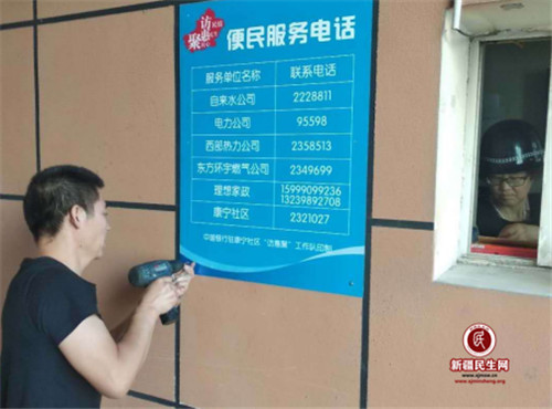 “一步一步来,先从最基础、百姓最需求处着手解决。”工作队杨军凯队长如是说。心动不如行动,搜集服务电话并逐个核实、联系制作销售商、与其它工作队沟通询价……2019年8月28日,铝合金便民服务电话牌在15个小区进门显眼处全覆盖悬挂,同时制作便民服务电话小卡片3000张逐户发放,让家家户户足不出户解急忧;挑选8个小区分别安装坐椅11把、乒乓球案子一张、棋牌桌1张,共计费用 14000余元。此举得到小区百姓的双手称赞。