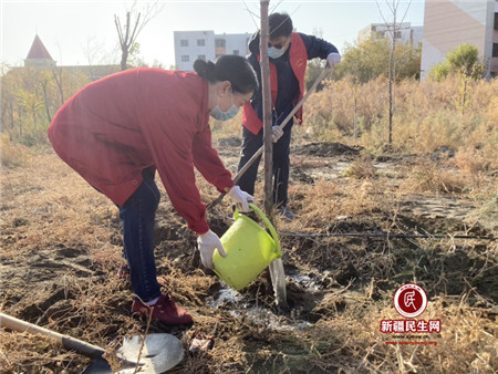 新疆民生网(甘玲)10月18日,克拉玛依市白碱滩区中兴路街道北盛社区东滨花园旁刚刚命名的“韶华林”里一派繁忙的景象,身穿火红的志愿者马甲的人们,挥舞着铁锹,挖坑铲土,浇水灌溉,种下棵棵小树苗, 这是北盛社区党总支组织开展的“红花配绿叶”志愿植树活动的现场。