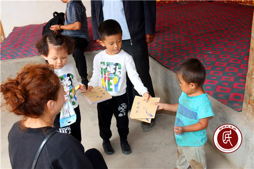 (上海东方卫视援疆干部刘江贤家里的小朋友向萨罕乡19村的小朋友赠送学习用品,传递温暖)