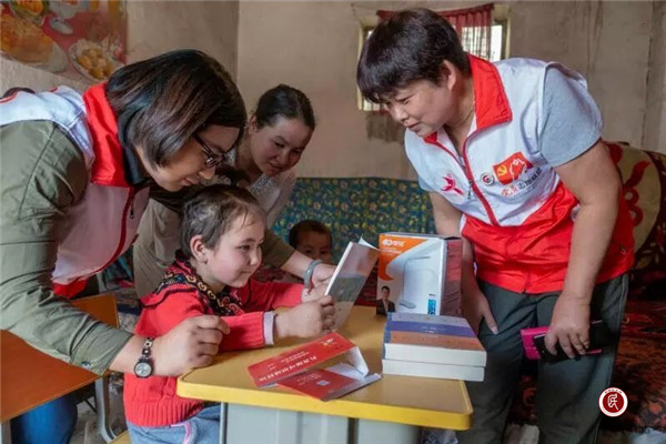 图二为:浙江海宁公益爱心联盟爱心人士向沙雅县沙雅镇向阳村贫困学生代表爱依拉·阿迪力赠送爱心书桌、书包及部分学习用品。