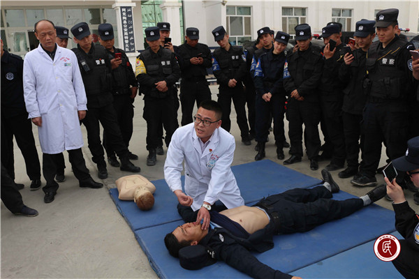 图为第九批援疆干部人才杨勇正在现场为公安干警演示徒手心肺复苏术